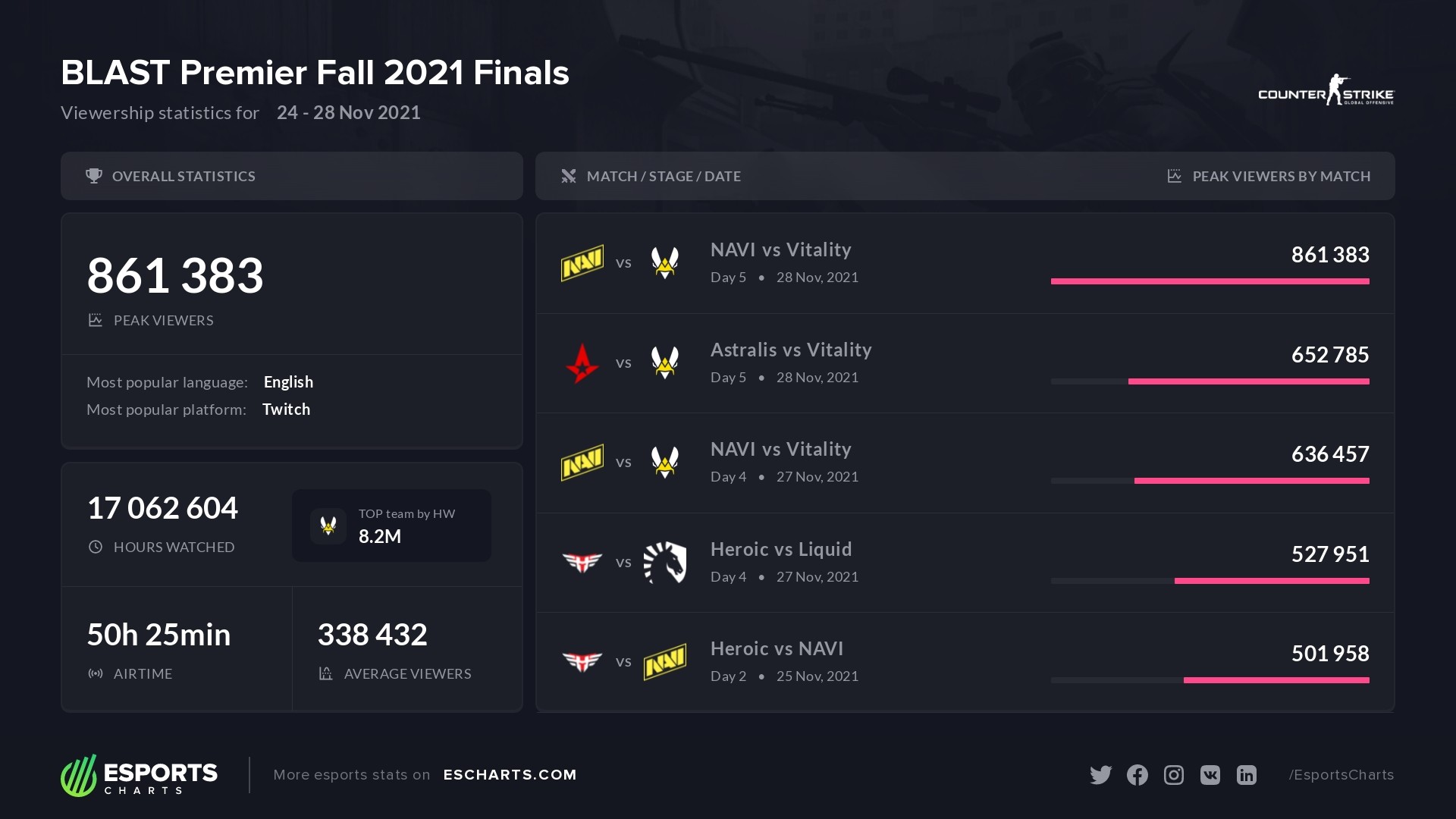has published the BLAST Premier: Fall Finals 2021 viewers stats. Within the top five most popular matches the grand final between NAVI and Team Vitality became the most viewed, with over 860,000 viewers at its peak.