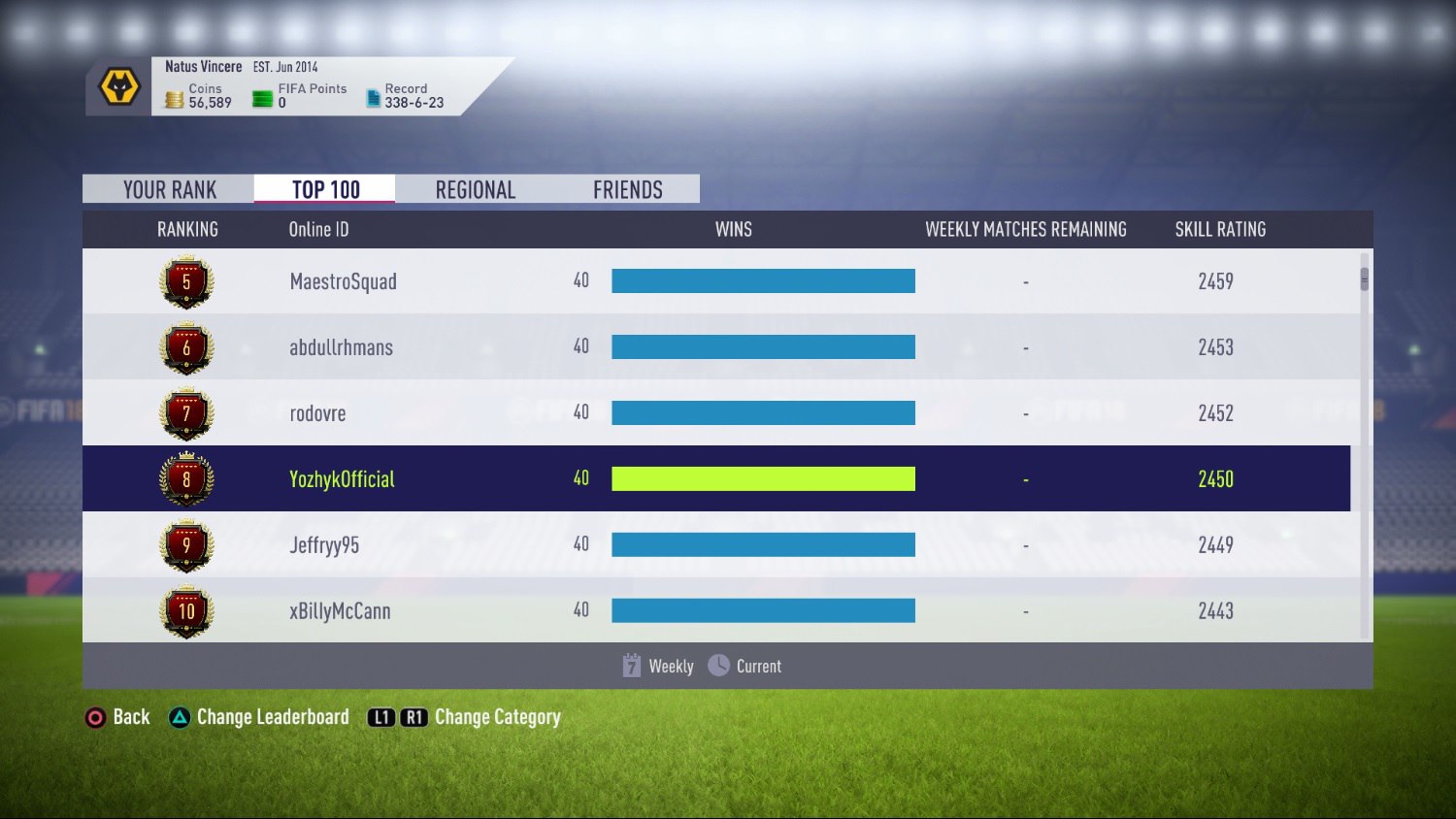 Natus Vincere G2A уже имеются четыре рекордных розыгрыша с абсолютными результатами, однако в версии FIFA 18 Евгений впервые прошёл столь долгий путь без поражений. Напомним, что ноябрь — отборочный месяц, и конкуренция сейчас особенно высока. Каждый из игроков прикладывает максимум усилий для того, чтобы получить шанс сыграть на Ultimate Team Championship. Наш футболист взял отличный старт: по итогам первых выходных месяца он занял восьмую строчку в рейтинге.