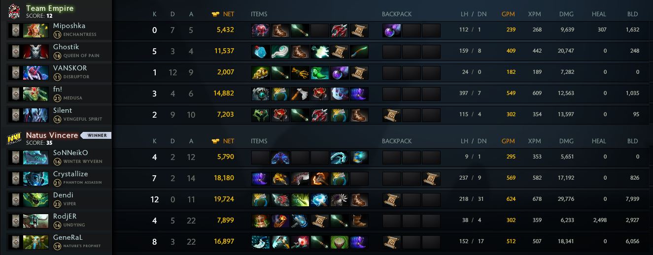 Team Empire и во второй партии: Рождённые Побеждать отдали предпочтение корам Phantom Assassin и Viper, а «Империя» сделала выбор в пользу Medusa для центральной линии и Queen of Pain — для сложной. Достаточно интересные противостояния развернулись на всех трёх лайнах, в результате на этот раз переиграть соперника на старте удалось «жёлто-чёрным».