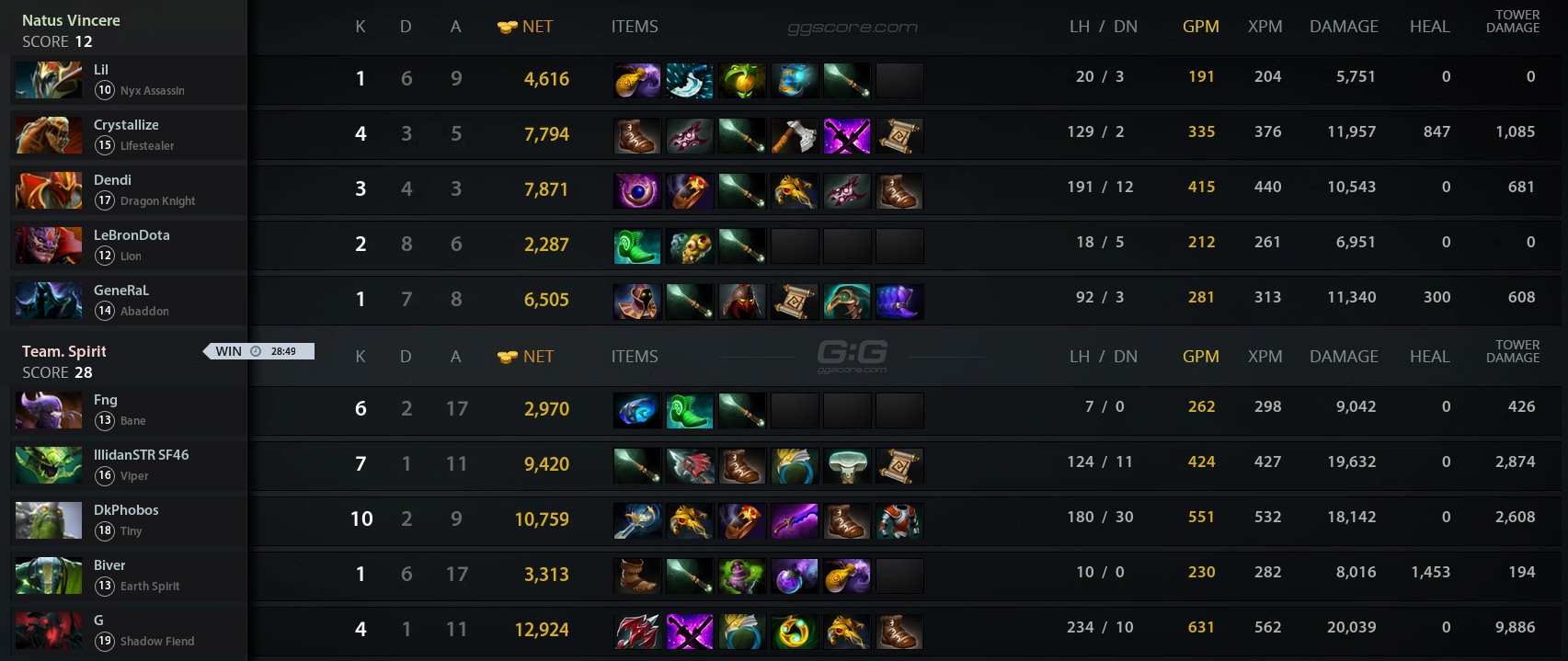 GeneRaL на этот раз попал нетипичный для него Abaddon. Во вражеском пике ключевые роли заняли Shadow Fiend и Viper. First blood оформили «драконы», им же удалось провести серию удачных вылазок. Атаки «жёлто-чёрных», напротив, оборачивались неудачами. К 10 минуте три верхние строчки в рейтинге ценности заняли персонажи