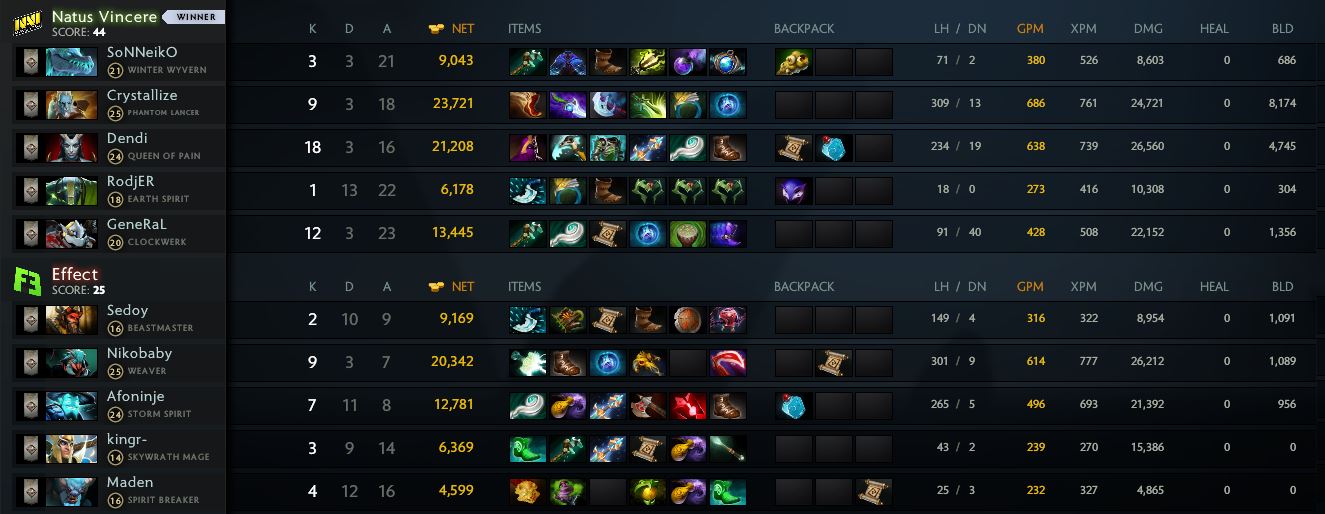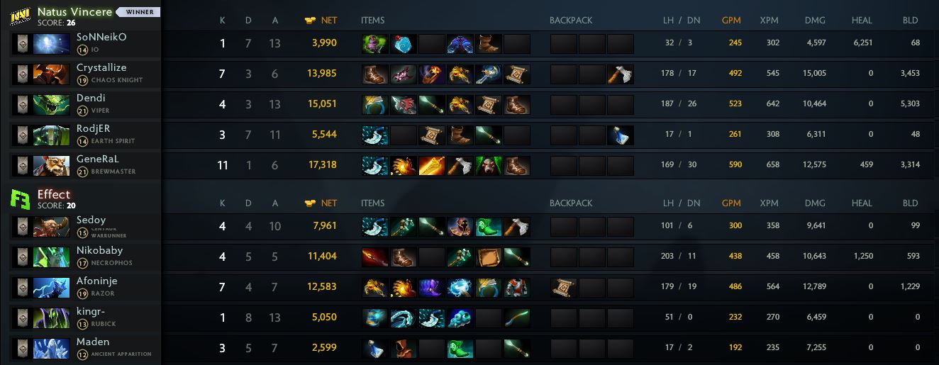 Effect рискнули использовать Smoke of Deceit и инициировали бой на нижней линии. Застать «жёлто-чёрных» врасплох оппонентам не удалось — парни достойно ответили на выпад и получили возможность разрушить постройки на всех трёх сторонах. Силы тьмы попытались продолжить противостояние, но красивая точка была поставлена уже в следующем массфайте. Блестящая победа