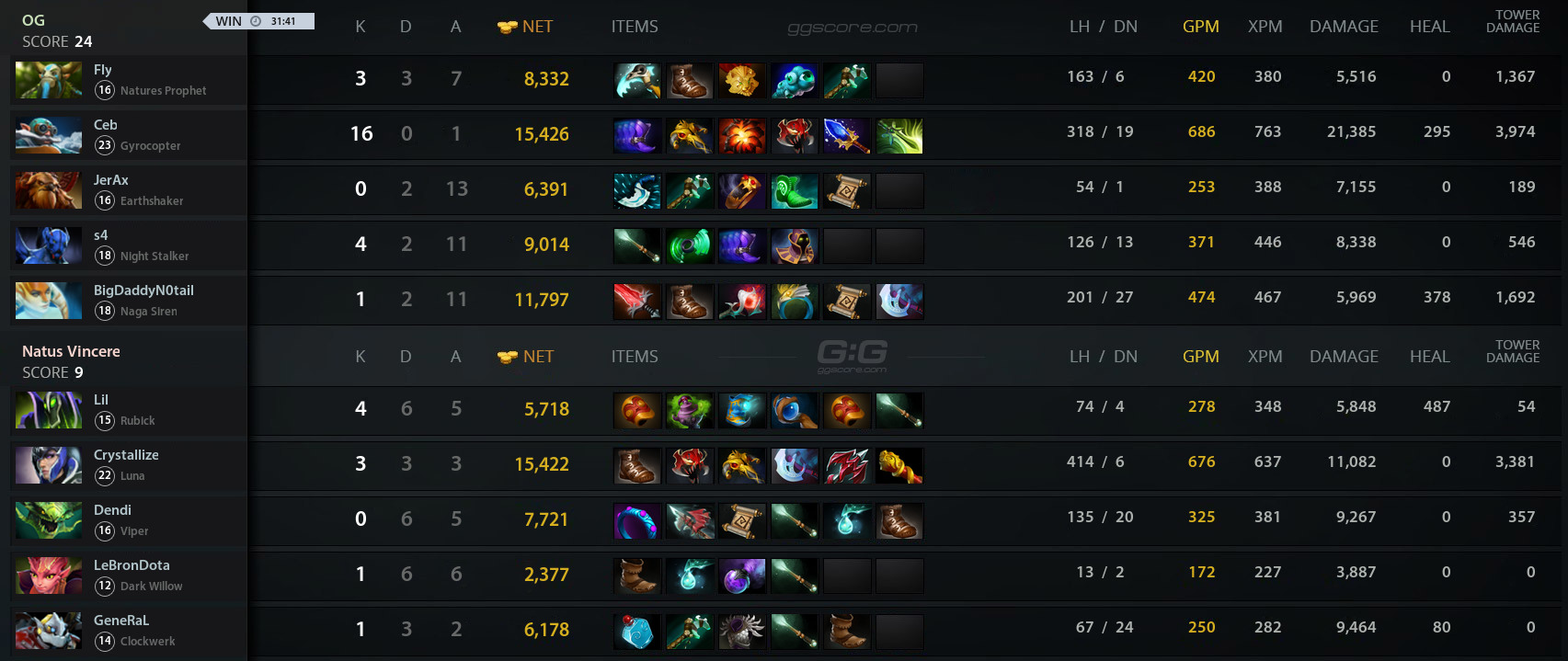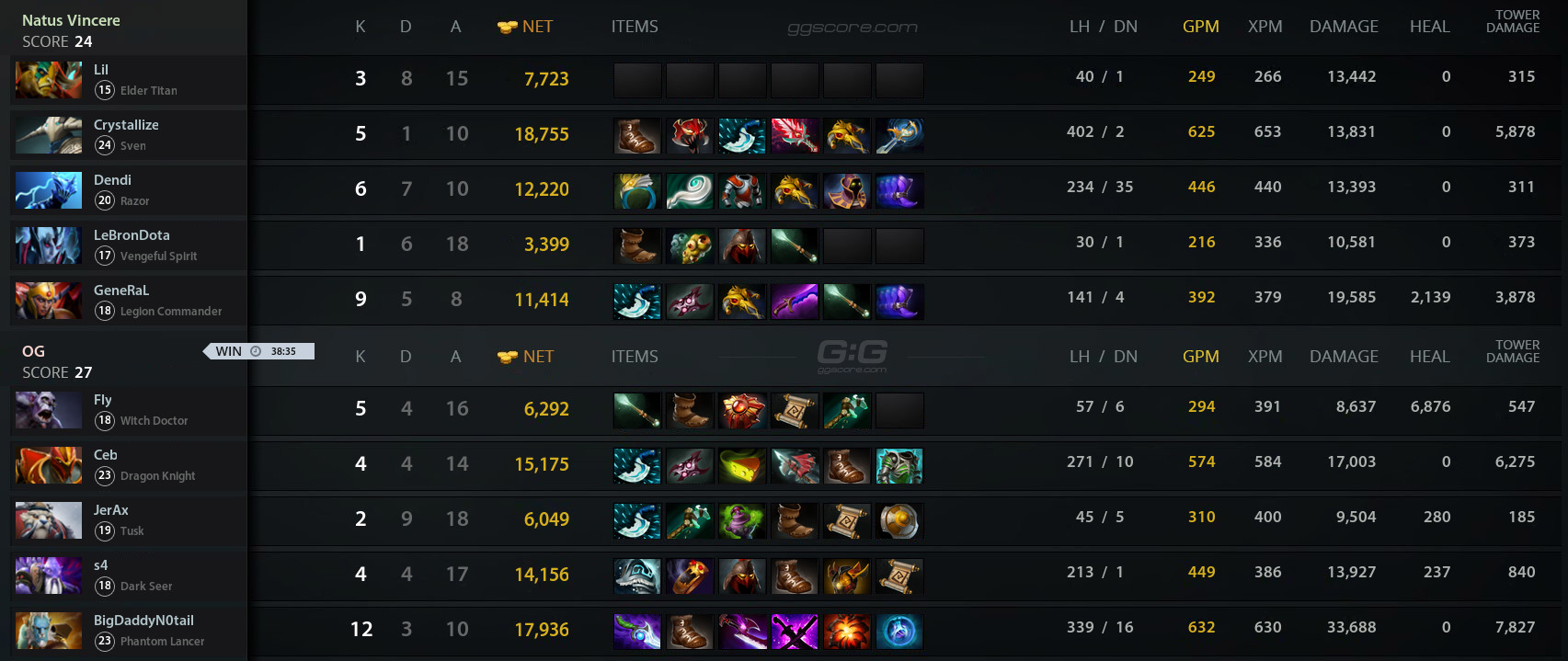 OG ответили тем же. В итоге соперники потеряли один барак, а Рождённые Побеждать лишились стороны. Ребята инициировали драку, однако она обернулась для них неудачей. Европейская пятёрка дождалась возрождения Рошана и обеспечила Эгидой Бессмертия Phantom Lancer.