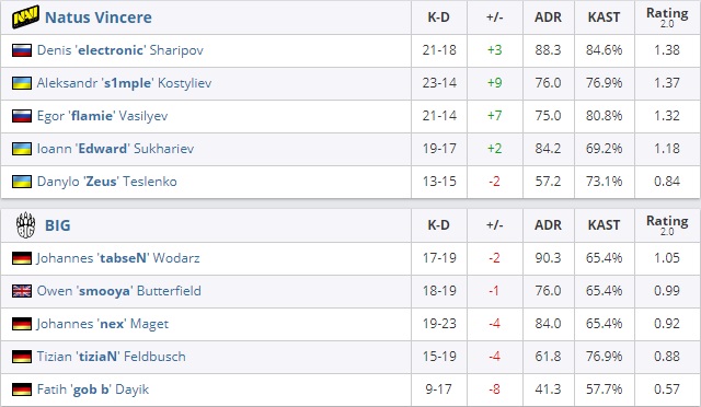 Natus Vincere: парни выиграли пистолетный раунд, force buy и эко. В дальнейшем игра проходила, что называется, на встречных курсах: ни одна из команд не хотела отдавать экономическое преимущество сопернику. Это непростое сражение выиграли немцы, за счёт чего вплотную приблизились к нашим ребятам — 3:4.