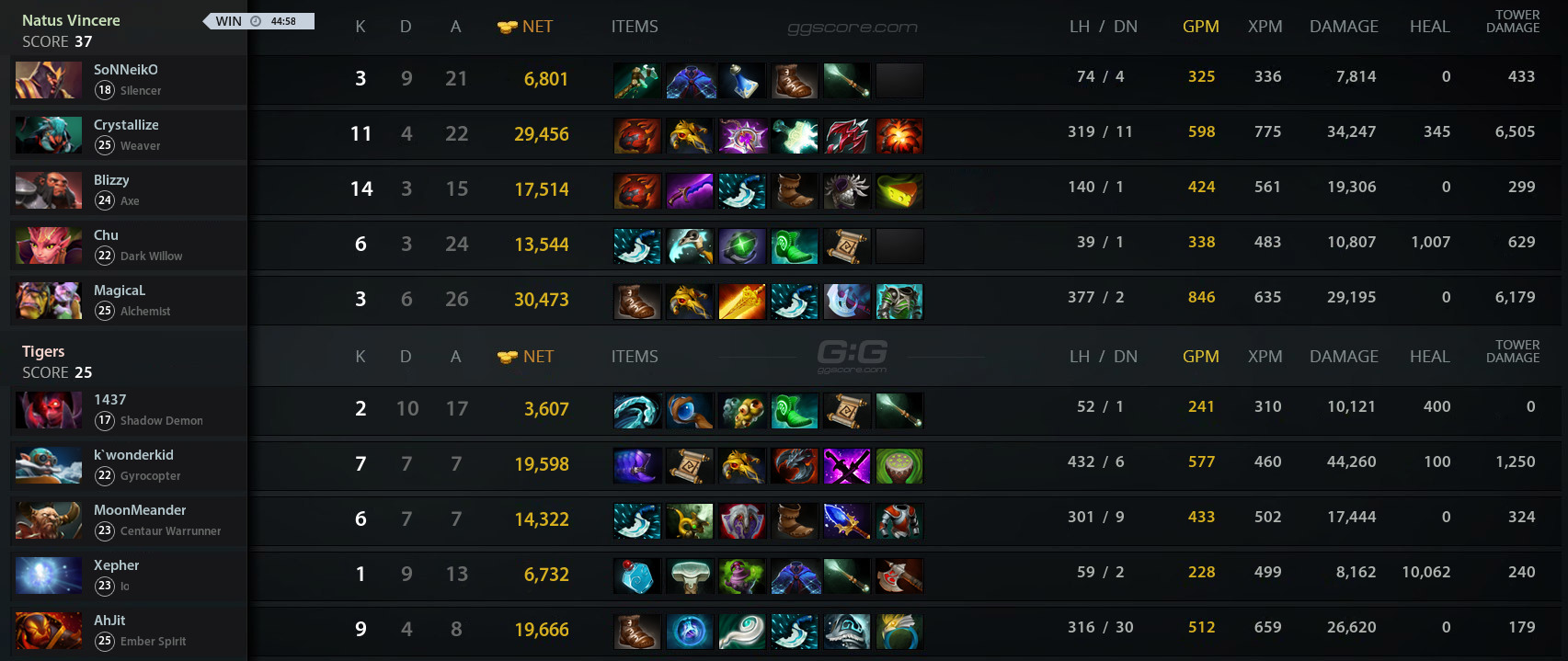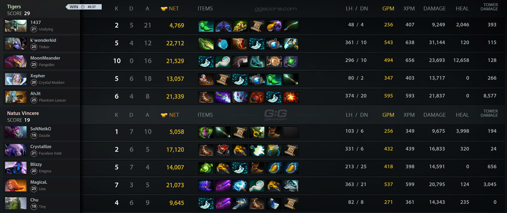 Tigers к этому моменту составил уже более 10 000 золота. В итоге оппоненты довели начатое до победного конца — матч завершается в пользу «тигров».
