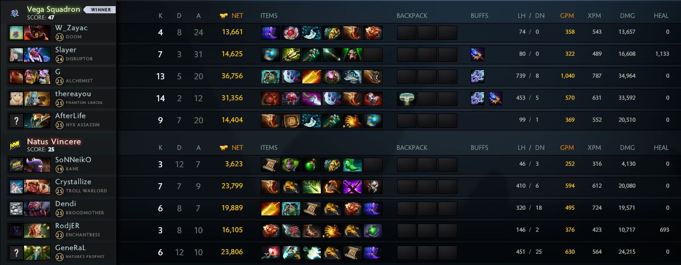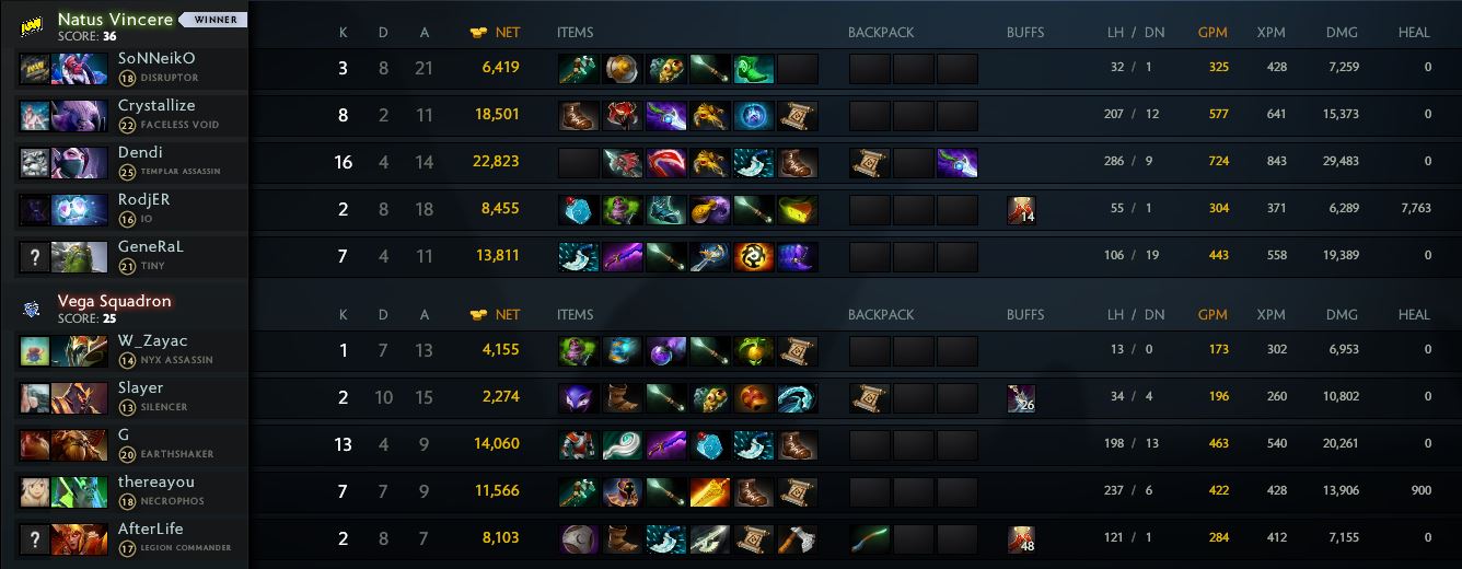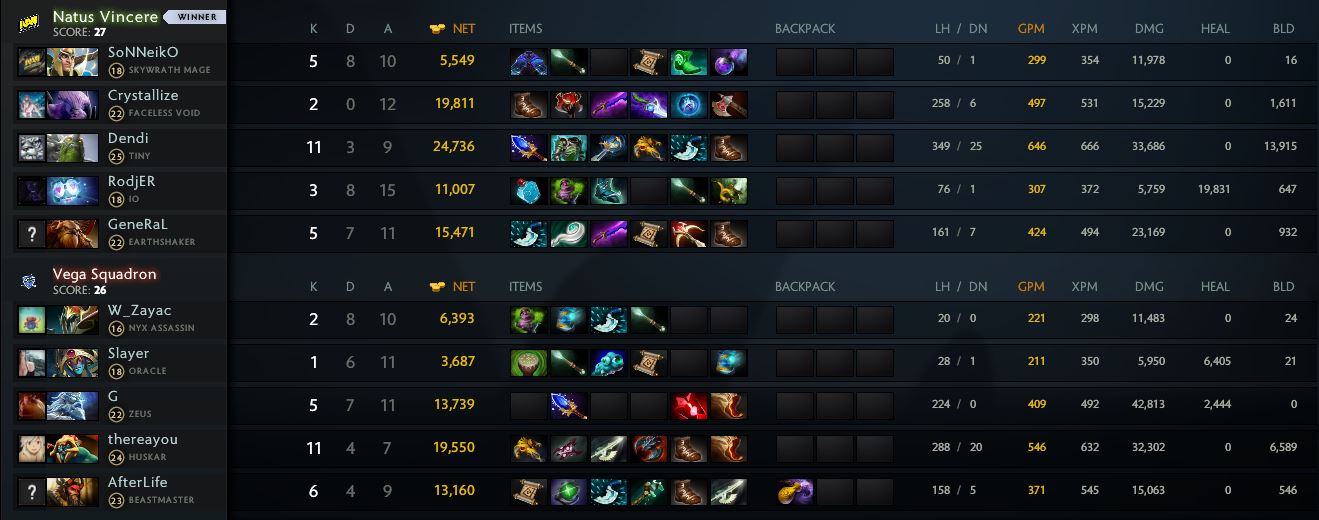 Vega Squadron оказались более результативными, а «жёлто-чёрные», в свою очередь, реабилитировались за счёт фарма крипов. Особое внимание игроки уделили стакам Древних крипов —