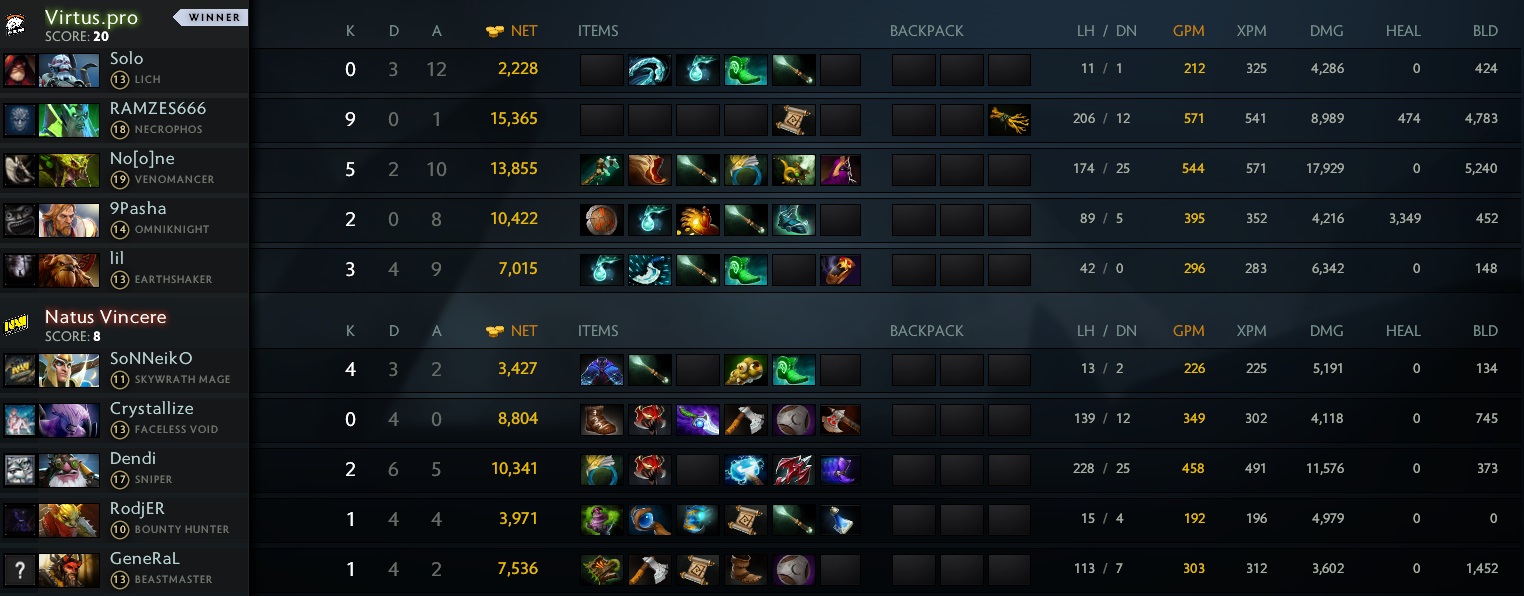 Virtus.pro по общей ценности — на 4 тысячи к 16 минуте. Кроме того, первые строчки по заработанному золоту занимали также соперники — Necrophos и Venomancer.