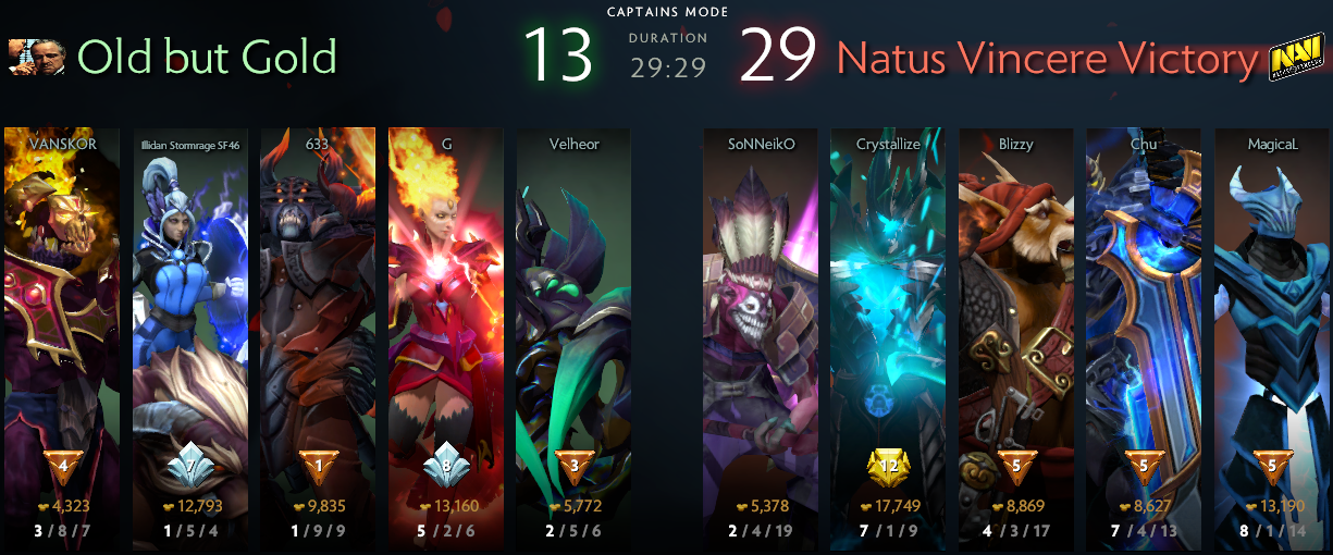 Old But Gold сдаваться раньше времени не собирались. Они устроили отличное сражение, итогом которого стало убийство Рошана. Правда, Aegis в итоге реализовать не получилось: наши ребята поймали вражеского керри, убили его дважды, а затем отправились пушить по нижней линии, сломав вышку и бараки, а также отправив в таверну нескольких персонажей. Итогом стало преимущество «жёлто-чёрных» в 4 тысячи к 27-й минуте розыгрыша первой карты.