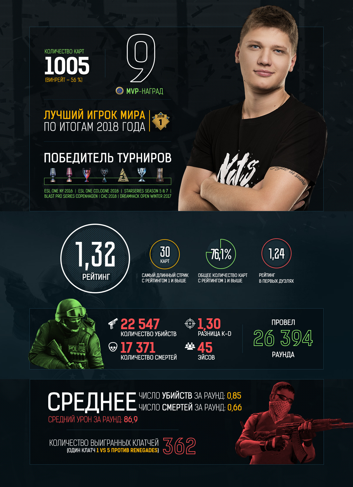 Александр «s1mple» Костылев преодолел рубеж – тысячную карту, сыгранную на профессиональном уровне. В честь этого события мы подготовили для вас инфографику, где вспомнили главные достижения Саши за этот период и отобрали наиболее интересные статистические показатели.