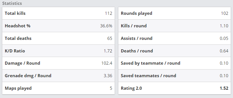 Возвращаясь к нашему герою, отметим, что он показал действительно впечатляющий результат: 112 убийств, K/D при этом составляет 1.72, а урон за раунд — 102.4. Статистика куда лучше слов доказывает, что