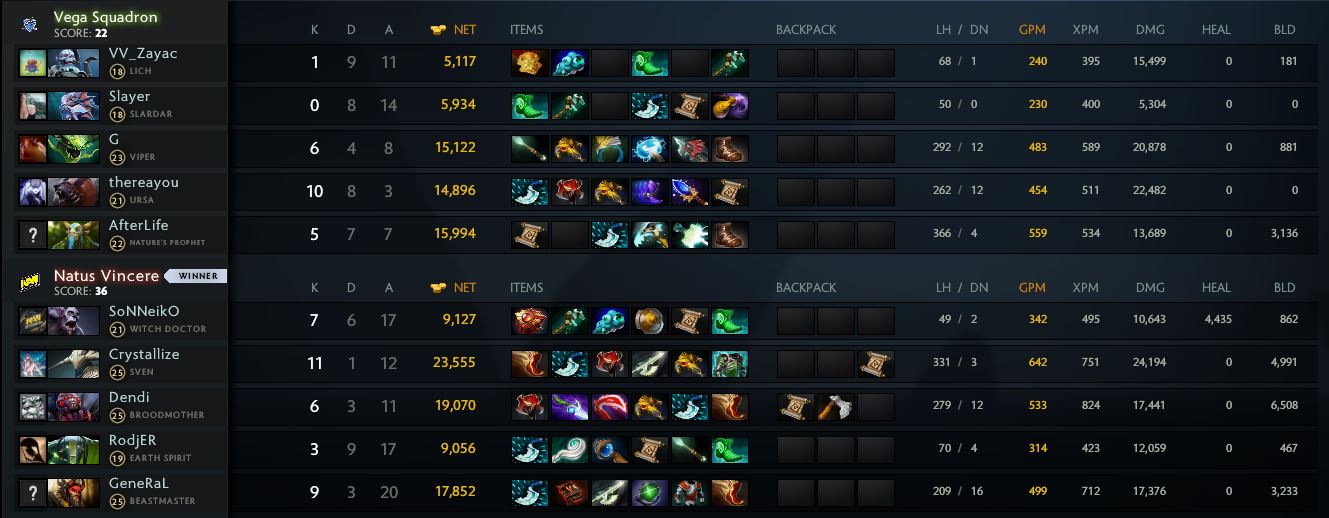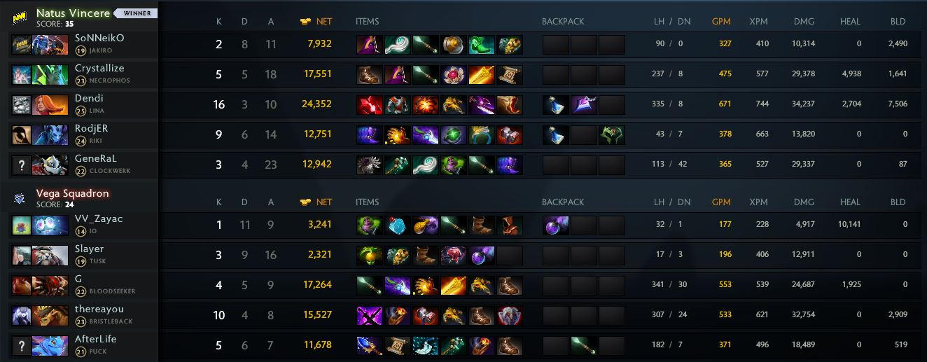 NaVi понесли потери, но оппоненты потеряли гораздо больше. В результате Силам тьмы удалось самостоятельно убить Рошана и забрать заветный Аегис — команда извлекла максимум пользы из ситуации. После этого эпизода коллективы действовали осторожнее, сосредоточившись на фарме и пуше и время от времени оформляя одиночные убийства: игроки