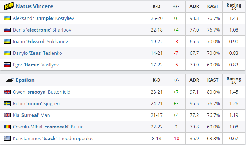 Epsilon же, одержав победу в двух оружейных раундах, перехватили инициативу и повели в матче со счётом 3:2. В первой половине встречи ключевым суждено было стать 7-му раунду, так как в случае проигрыша в нем команда получала сброс экономики. И в этом эпизоде сильнее оказался европейский коллектив.
