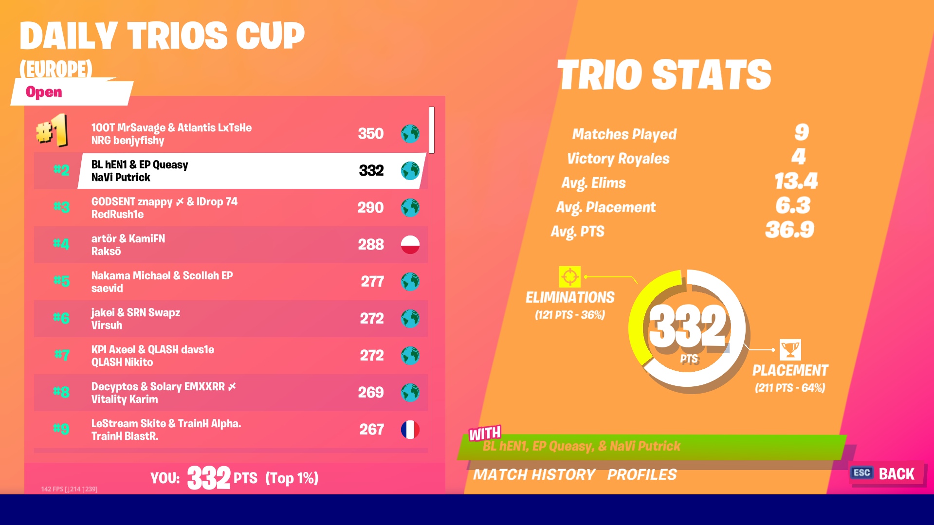 За отведенное время ребята успели сыграть девять матчей и набрать в общей сложности 332 очка. Большинство из них было начислено за плейсмент: за весь игровой день трио лишь единожды не вошло в топ-15, а победу праздновало четыре раза.