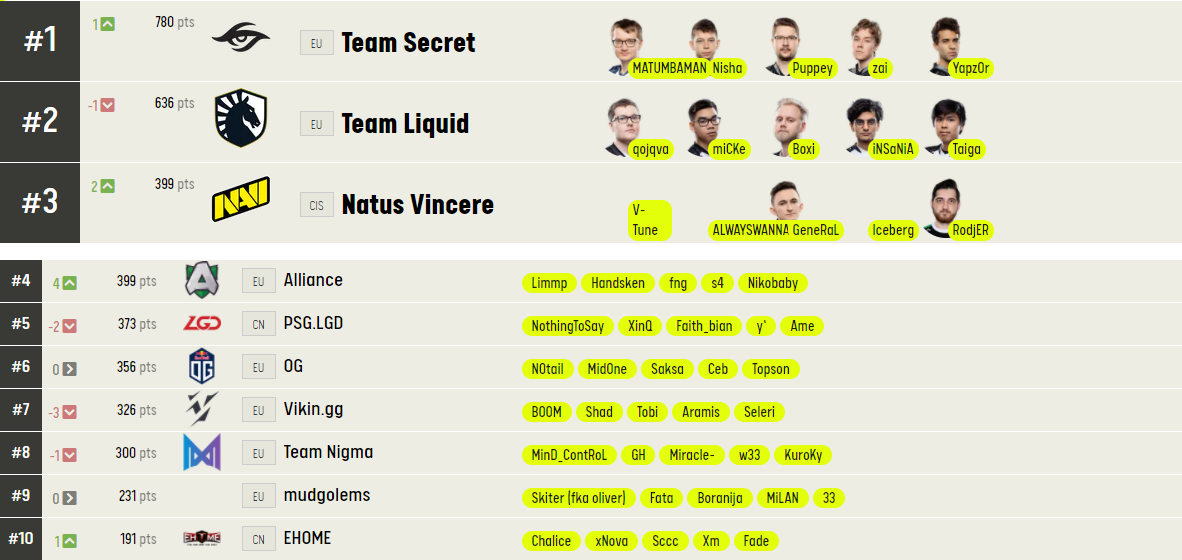 Team Secret с 780 очками. Второе место занимает