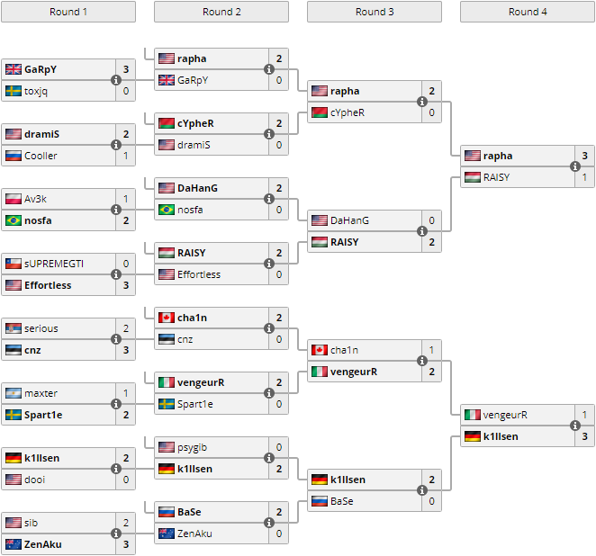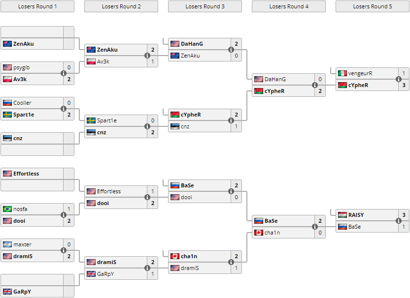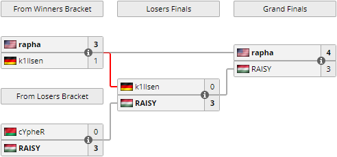 rapha. Он считался абсолютным фаворитом после того, как по результатам регулярного сезона не только стал победителем всех матчей, но при это ещё не проиграл даже одной карты. Увы, несмотря на все старания Алексея, он уступил со счётом 0 : 2 и упал в нижнюю сетку турнира.