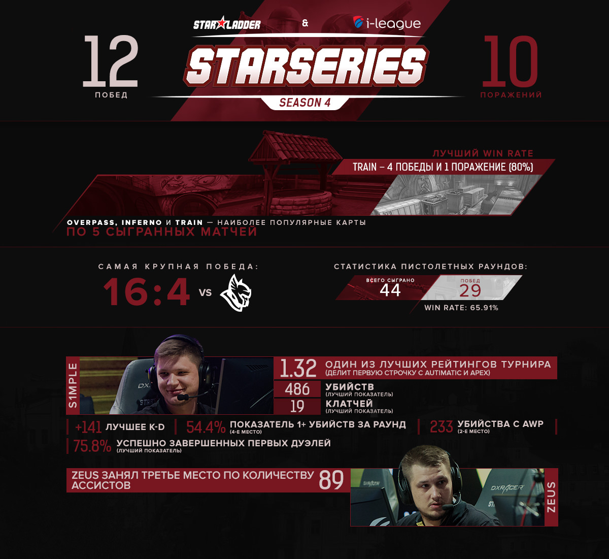 По окончании StarSeries S4 мы собрали для вас наиболее интересную статистику игр Рождённых Побеждать на этом турнире. Среди представленных показателей вы найдёте индивидуальную статистику игроков