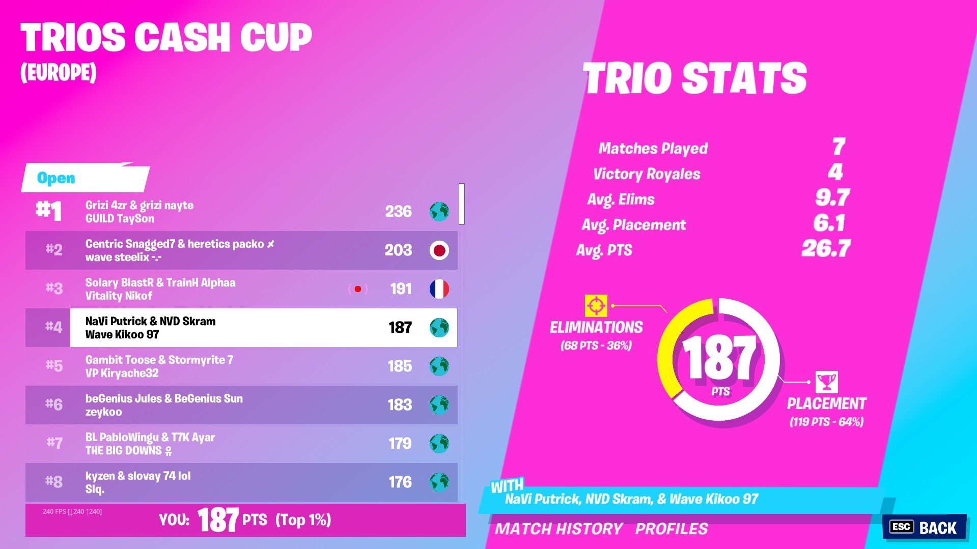 NVD Skram сыграли семь матчей, одержав в четырёх из них победу. Этого хватило для успешного попадания в топ. Всего команда набрала 187 очков. Большинство было начислено за плейсмент.