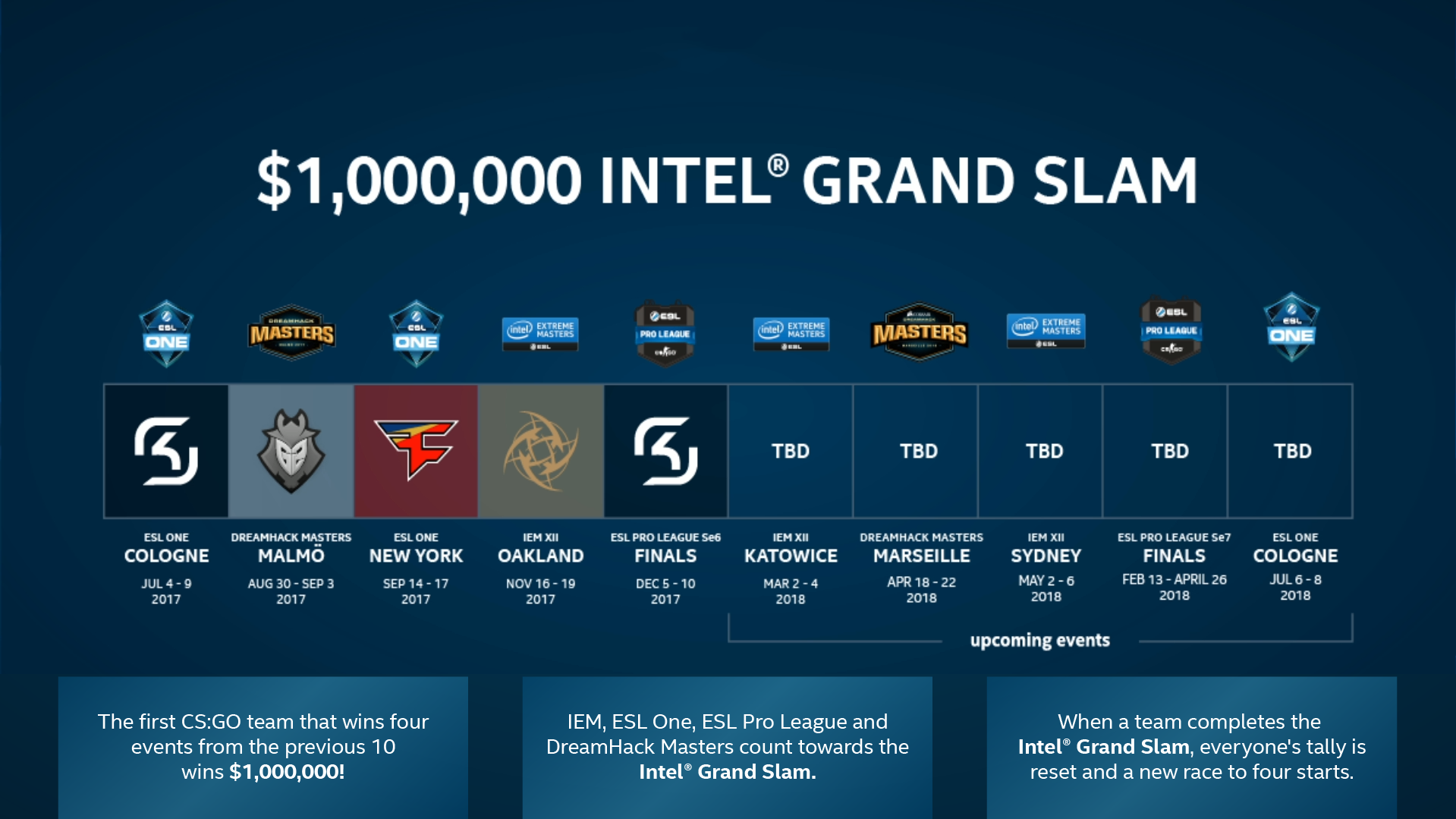 Стоит отметить, что DreamHack Masters Marseille 2018 является частью Intel Grand Slam, а это значит, что команды приложат максимум усилий, чтобы ещё на один шаг приблизиться к заветному призу в $ 1 000 000 — такую сумму получит четырёхкратный чемпион турниров от ESL и DreamHack. Ближе всех к выполнению челленджа
