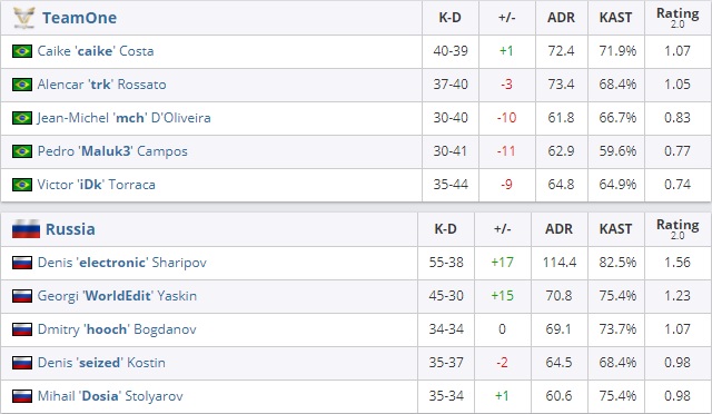 На de_overpass обе пятёрки продемонстрировали хорошую игру в защите, но российский коллектив успешнее выступил за сторону атаки, заработав 6 очков. Таким образом, первая карта отошла в копилку Team Russia (16:11). На de_train события разворачивались более напряжённо, так как после неудачной игры в защите (5:10), бразильцы не собирались сдаваться без боя и практически перевели игру в овертайм. Однако в ключевых моментах ребята из