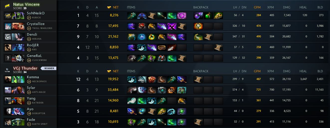 VGJ.Thunder сумели провести серию успешных гангов и захватить контроль над картой: герои «жёлто-чёрных» погибали в разных точках, не имея возможности самостоятельно инициировать массфайты. Тем не менее,